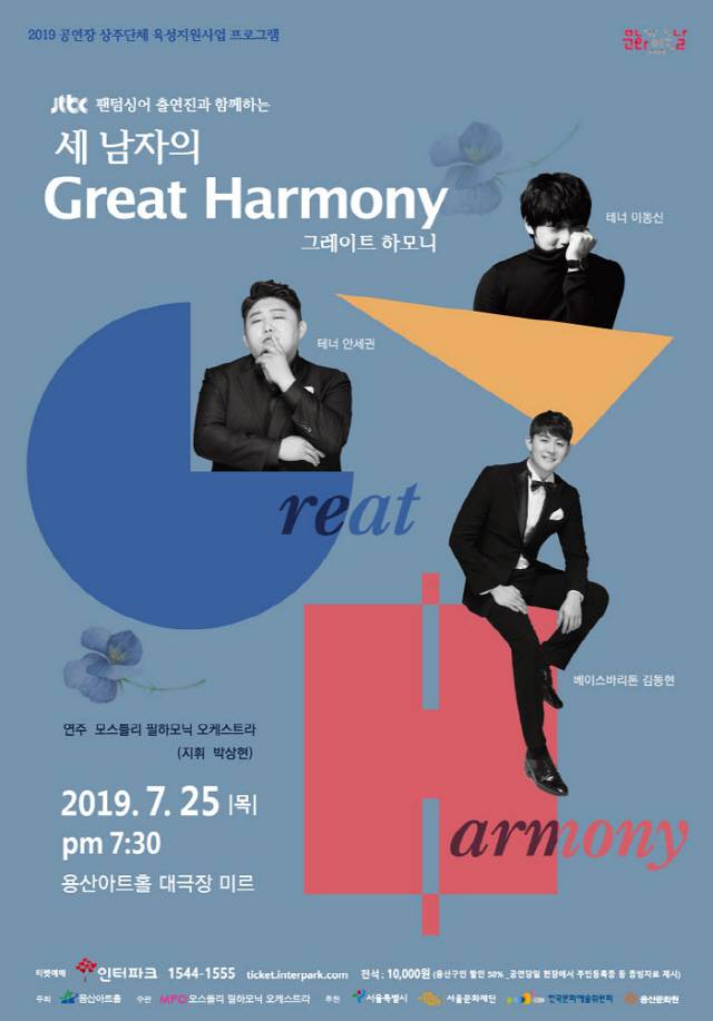 ‘세 남자의 Great Harmony’는 인터파크 티켓에서 예매 가능하며 서울특별시 용산구민은 50% 할인혜택을 받을 수 있다.