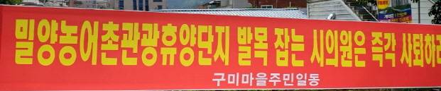 이 사업과 관련 지난 24일 제5차 총무위원회가 개최되는 날 아침 밀양 시내 곳곳에 관변단체, 각 동 청년회. 마을주민회, 밀사모, 일우회 등 단체에서 시민이 원하는 농어촌관광 휴양단지 반대하는 시의원은 즉각 사퇴하라. 밀양농어촌관광휴양단지 조속한 추진을 촉구한다 등의 내용이 담긴 현수막이 내걸렸다.