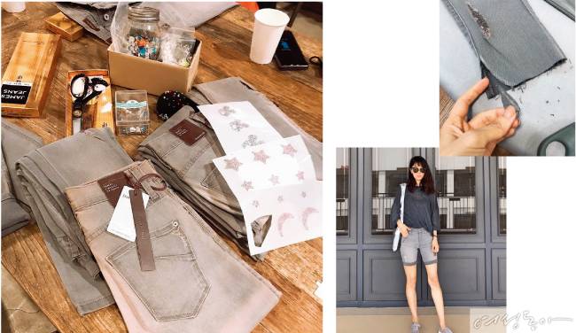 "프리미엄 청바지 제임스진스 제깅스를 리폼해 이번 시즌 유행인 반바지와 디스트로이드 진을 만들었어요. 우선 반바지를 만들기 위해 제깅스를 뒤집어 초크로 자르고자 하는 부위에 표시를 해요. 이때 다리가 날씬해 보이는 길이를 찾는 게 중요하므로 직접 입고 자를 위치를 찾는 것이 포인트. 커팅이 끝난 뒤에는 술을 내요. 바늘이나 핀셋 등으로 자른 부위에서 술을 빼면 됩니다. 또 다른 청바지는 일명 '찢청’ 디스트로이드 진을 만들었어요. 무릎 부위를 찢는 것이 가장 무난한데 입은 상태에서 무릎을 구부리고 표시한 다음 찢어야 해요. 사포로 밑단은 물론 찢어진 부위를 살살 문지르면 더 자연스럽고 멋진 디스트로이드 진을 만들 수 있어요. 반바지는 제가 입고, 디스트로이드 진은 딸에게 선물했는데 딸도 너무 만족스러워하네요."