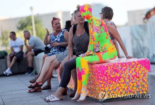 epa07742754 People talk next to a mannequin plastered in price tags on a bench as part of the awareness action 'Strich / Code / Move' in Berlin, Germany, 26 July 2019. The art project by a group of people wants to draw attention to the problematic on the prostitution protection law effective since 2017 and bring to the public the everyday problems of sex workers. Social community workers and sex workers campaign for more respect to those involved in sex work. EPA/FELIPE TRUEBA
