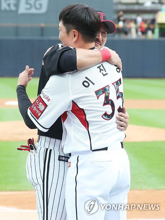 (수원=연합뉴스) 홍기원 기자 = 2018시즌을 끝으로 은퇴한 '국민 우익수' 이진영이 28일 오후 경기도 수원시 케이티위즈파크에서 열린 은퇴식에서 송별사를 한 LG 박용택과 포옹하고 있다.