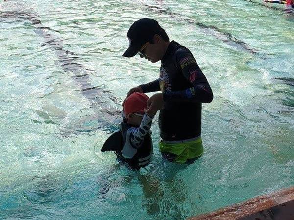 사진 속 신정환은 아들과 수영장과에서 즐거운 시간을 보낸다.