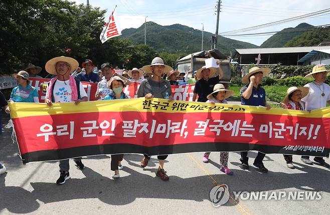(성주=연합뉴스) 김현태 기자 = 31일 오후 경북 성주군 초전면 소성리 마을회관 앞에서 소성리사드철회성주주민대책위원회, 사드배치반대김천시민대책위원회, 원불교성주성지수호비상대책위원회 등 6개 단체로 구성된 사드철회 평화회의 관계자들이 사드(THAAD·고고도미사일방어체계) 기지 내 공사를 반대하는 기자회견을 한 후 마을회관 앞에서 행진을 하고 있다. 2019.7.31