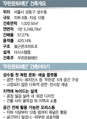 요새 서울에서 가장 ‘힙’하다고 소문난 성수동에서 처음 문화·예술 공간으로 자리 잡은 우란문화재단은 위트 있고 독특한 외관으로 눈길을 끈다. 전시·공연 등이 가능한 문화·예술 공간인 1~3층은 마치 어린아이가 스케치북에 그린 공장처럼 생겼다. 그 뒤로 우뚝 솟은 12층짜리 오피스 건물은 블록을 엇갈려 쌓은 것처럼 보인다. 지난해 10월 모습을 드러낸 우란문화재단은 주변의 낮은 건물 사이에서 높다랗게 서 있지만 튀거나 어색하지 않고 주변과 자연스럽게 어울린다.