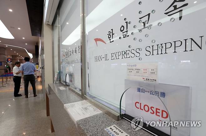 (부산=연합뉴스) 손형주 기자 = 1일 오전 부산 동구 부산국제여객터미널에 있는 한일고속해운 창구가 닫혀 있다. 부산과 대마도를 오갔던 오로라호를 운항했던 한일고속해운은 일본 여행객 감소 여파로 내달 30일까지 운항을 중단했다. 2019.8.1