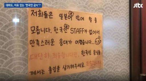 한국인 관광객과 갈등이 빚어졌던 일부 가게에서는 아예 ‘한국인 손님을 받지 않겠다’고 적은 종이를 출입문에 내걸기까지 했다.
