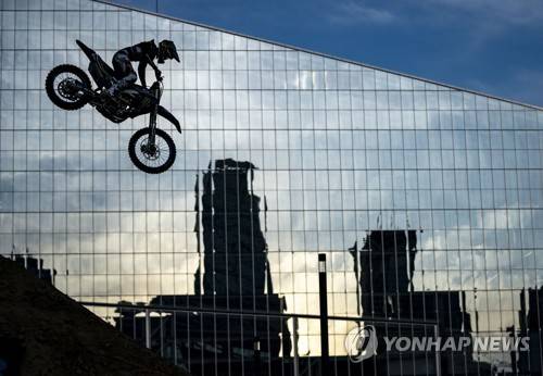 Jarryd McNeil clears the pipe during the Moto X Step Up event in front of U.S. Bank Stadium in Minneapolis on the first day of X Games competition Thursday, Aug. 1, 2019. (Alex Korman/Star Tribune via AP)