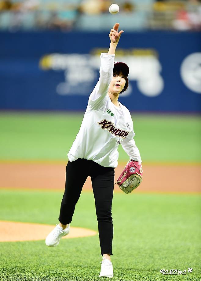 [엑스포츠뉴스 고척, 김한준 기자] 3일 오후 서울 구로구 고척스카이돔에서 열린 '2019 신한은행 MY CAR KBO리그 KT 위즈와 키움 히어로즈의 경기, 경기 전 배우 윤슬이 시구에 임하고 있다.
