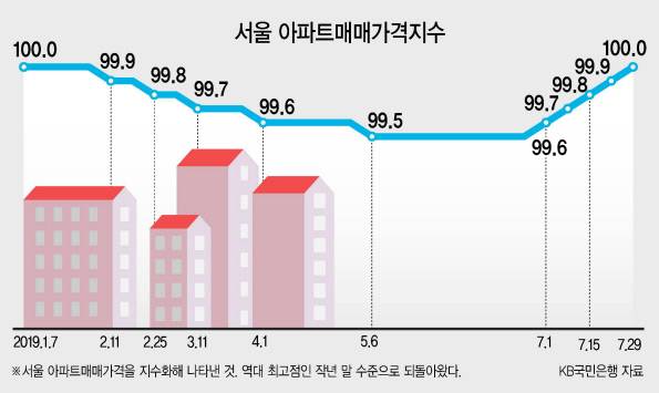 KB국민은행이 발표한 ‘주간 주택시장동향조사’ 결과에 따르면, 7월29일 기준 서울 아파트값은 지난해 말(12월31일 기준) 대비 0.01% 상승한 것으로 나타났다. 지난해 말은 역대 최고점이었던 그해 12월17일에 비해 0.01% 하락한 시점이었다는 점을 감안하면, 현재 집값이 역대 최고점으로 되돌아온 것이다.