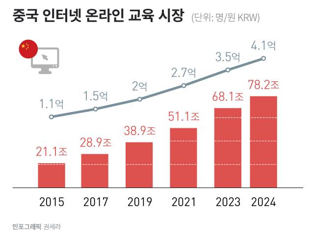 온라인 강의 수강 학생도 2015년 처음으로 1억 명을 돌파한 뒤 올해 2억 명, 2024년에는 4억1천만 명으로 늘어날 전망이다. 시장 규모와 수강 학생 모두 10년 동안 4배 성장할 거라는 거다. 나는 비록 못 배웠지만, 내 아이만은 그렇게 키우고 싶지 않은 중국 학부모들의 교육열이 만들어낸 성장이다.