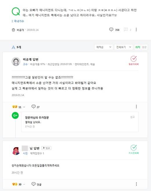지난 1월 네이버 지식인에는 “아는 오빠가 매니지먼트 다니는데, ㄱㄷㄴㅇ(ㅇㄴㅇ) 이랑 ㅈㅎ(ㅌㅇㅇㅅ) 사귄다고 하던데… 여기 매니지먼트 쪽에서는 소문났다고 하더라구요… 사실인가요??”라는 질문이 올라왔다.