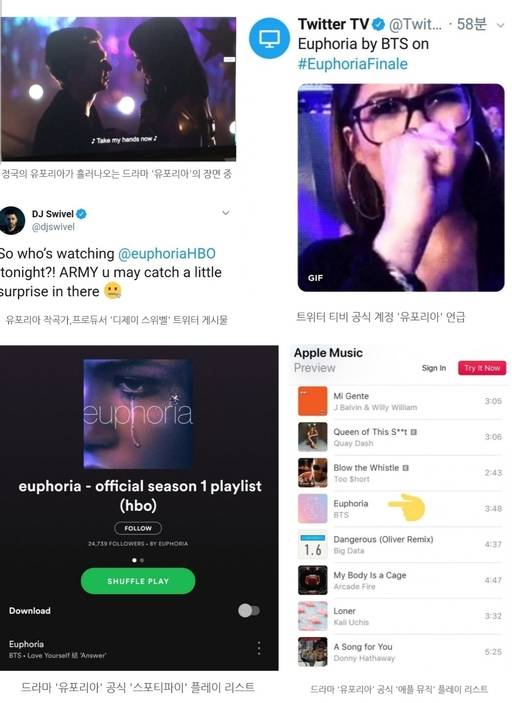 이에 트위터 티비 공식 계정 '트위터 티비'에서 정국의 유포리아가 흘러 나왔음을 언급하는 게시물을 게재했고 드라마 ‘유포리아’ 공식 '애플뮤직·스포티파이' 오피셜 플레이 리스트에도 방탄소년단 정국의 유포리아를 추가해 큰 놀라움을 자아냈다.