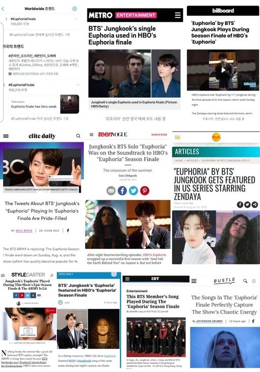 미국 매체 빌보드는 "두 캐릭터가 키스하는 장면에 유포리아가 들리며 순간 로맨틱한 분위기를 더했다"라고 전하며 드라마 유포리아의 첫 시즌 마지막회를 장식한 점을 보도했고 영국 매체 '메트로'에서도 "HBO 유포리아 피날레에 사용된 방탄소년단 정국의 솔로곡 유포리아"란 제목으로 즉시 기사를 보도했다.