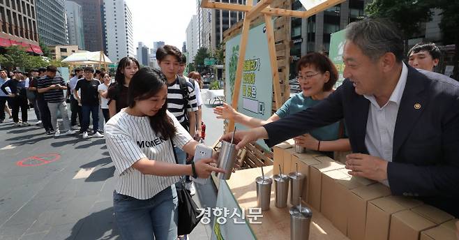 여름철 일회용컵 사용을 줄이기 위해 6일 오전 서울 청계천 광장에서 열린 ‘텀블러 사용 생활화 캠페인’에서 박천규 환경부 차관(오른쪽)이 행사에 참여한 시민들에게 텀블러를 나눠주고 있다.