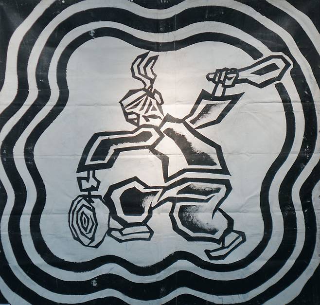 '북춤' '징'〈사진〉'춤' 등 이번에 실물이 확인된 8점의 걸개그림은 한국 특유의 율동미를 간결하고 굵직한 선으로 옮긴 오윤의 전형적인 색깔을 보여준다. 현장 미술을 상징하는 오윤의 현존 걸개그림은 희귀한 데다, 기존 오윤의 판화 대표작을 그보다 앞선 시기에 유화로 그린 작품이 다수 포함돼 눈길을 끈다. 특히 4점의 '칼노래'는 지난해 서울옥션 경매에서 국내 판화 최고 낙찰가 기록(7500만원)을 세운 동명의 목판화 '칼노래'(1985)를 광목천에 그린 것으로, 각각 동·서·남·북을 의미한다고 한다. 가로·세로 2m 남짓으로 큼직한데, 풍물놀이 장면이 담긴 걸개그림 '춘무인 추무의(春無仁 秋無意)'는 340×343㎝ 규모다. 제목은 '봄에 씨앗을 뿌리지 않으면 가을에 거둘 것이 없다'는 의미다.