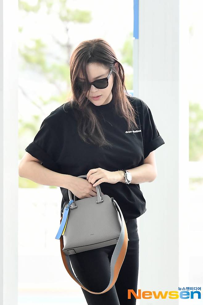 배우 박시연이 공항패션을 선보이며 인도네시아 발리로 출국하고 있다.