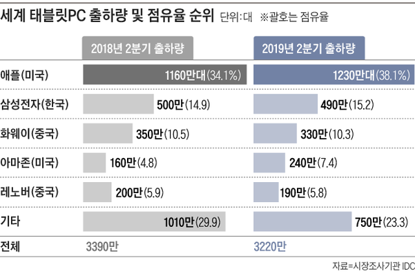 올 2분기 전체 태블릿PC 출하량은 3220만대로 지난해 2분기(3390만대)보다 5% 줄었다.