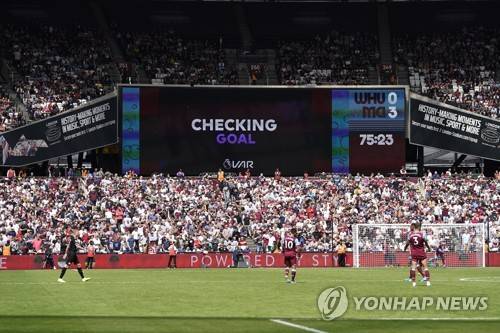 epa07766133 A screen displaying a VAR check during the English Premier League soccer match between West Ham and Manchester City at the London Stadium, London, Britain, 10 August 2019. EPA/WILL OLIVER EDITORIAL USE ONLY. No use with unauthorized audio, video, data, fixture lists, club/league logos or 'live' services. Online in-match use limited to 120 images, no video emulation. No use in betting, games or single club/league/player publications