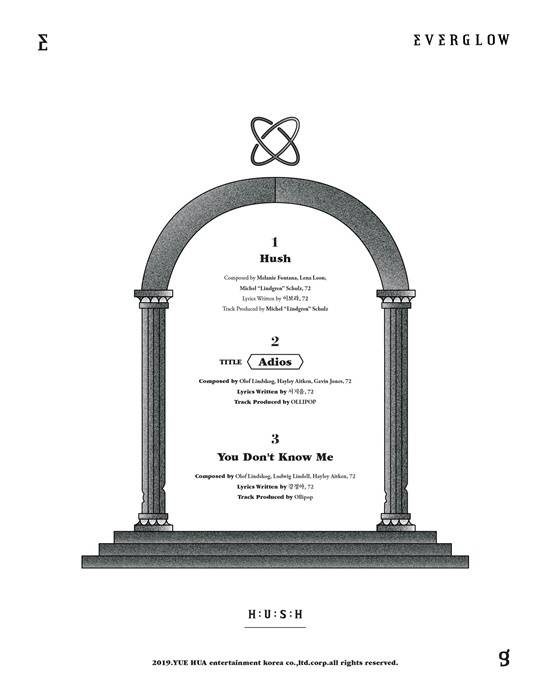 공개된 사진 속 에버글로우의 두 번째 싱글앨범 ‘HUSH’의 수록곡은 총 3곡. 앨범명과 동일한 수록곡 Hush, 타이틀곡 Adios, 에버글로우의 또 다른 매력을 느낄 수 있는 You Don’t Know Me로 구성된 이번 앨범은 에버글로우의 독보적인 콘셉트인 ‘스파클링 시크’를 한층 더 강화한다.