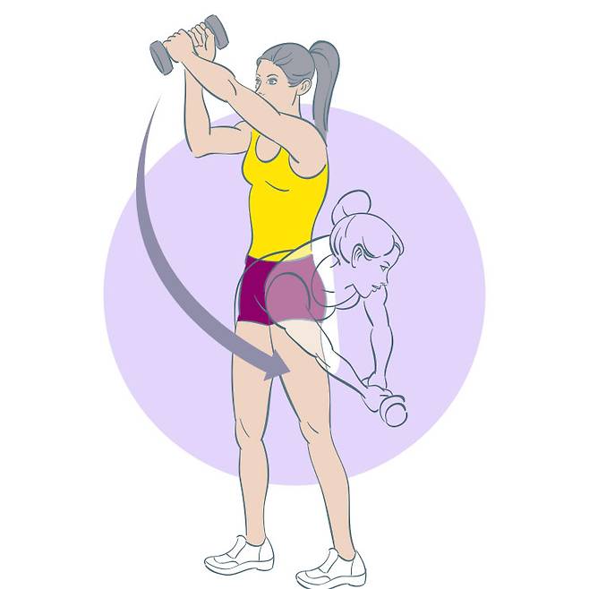 3 이번에는 반대로 덤벨을 오른쪽 위로 휘둘러 처음 자세로 돌아간다. 한쪽을 30초간 반복한 뒤 방향을 바꿔 나머지 30초간 실시한다.