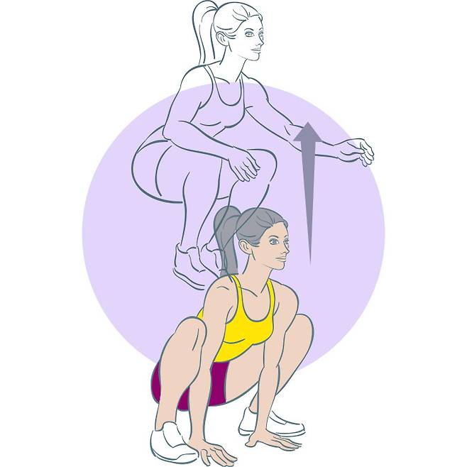 3 바닥에 착지하자마자 바로 다시 뛰어오른다. 이 동작을 반복하되 착지할 때 가능하면 손은 바닥을 짚는다.
