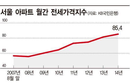 2007년 9월 56.6이던 서울 아파트 전세가격지수는 2008년 55.6으로 소폭 내리다 2009년 60.1, 2012년 74.8, 2014년 85.4 등 민간택지 분양가 상한제 시행 기간 동안 무려 50.88% 급등했다.