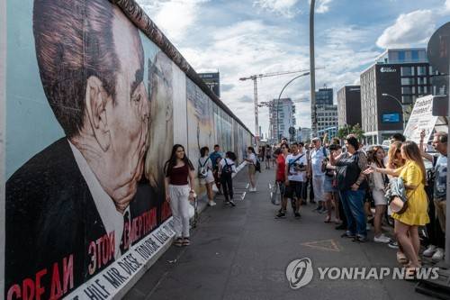epa07769247 Visitors huddle in front of the wall painting 'My God, Help Me to Survive This Deadly Love' at the East-Side Gallery in Berlin, Germany, 11 August 2019. The official order for the start of the construction of the Berlin wall was issued on 13 August, 1961. The roughly 43 kilometer barrier included watch towers, check-points, barbed wire and mines, creating a border strip separating the Western Allies' enclave of West Berlin, from the rest of the city. The wall fell on 09 November, 1989. EPA/OMER MESSINGER