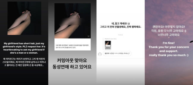이어 “사람들은 생각들이 다르고 동성애를 혐오 하실 수 있다. 네, 혐오하셔도 돼요. 그건 각자의 가치관이고 제가 동성애를 이해해 달라고 좋아해 달라고 강요하는 게 아니에요. 저도 저 좋아해 달라고 구걸하고 저를 알아 달라고 하는 게 아니에요. 이렇게까지 많은 관심을 받게 될 줄 몰랐고 그저 남들과 똑같이 연애하고 사랑하는 걸 숨기고 싶지 않았을 뿐이에요”라고 덧붙였다.