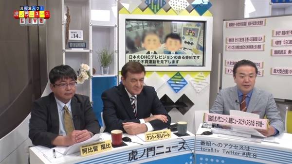한편, DHC TV는 이날도 '도라노몬 뉴스'를 통해 일본의 우익 성향 일간지 <산케이신문>의 아비루 루이 논설위원과 일본에서 활동하고 있는 미국인 변호사 켄트 길버트가 출연해 혐한 발언을 쏟아냈다.