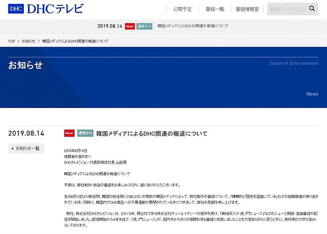 | ▲ 일본 화장품 기업 디에이치씨(DHC)의 자회사 DHC TV의 '혐한 논란' 관련 입장문 갈무리. |
