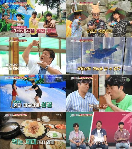 이처럼 유민상-서태훈-이세진은 수도권의 핫한 맛집과 액티비티를 섭렵해 시선을 사로잡는 한편, 매 순간 터져 나오는 유쾌한 개그감으로 시원하고 청량한 웃음을 전파했다. 이에 ‘인기쟁이 썸머 페스티벌’이 방송된 직후 각종 SNS와 온라인 커뮤니티에서는 “계곡물 보기만 해도 시원하다. 역시 여름엔 계곡이지”, “실내 스카이다이빙이란 게 있구나~ 재밌겠다”, “와 대통찜 비주얼 압권. 먹어보고 싶네요”, “유민상-서태훈-이세진 케미 좋네. 보는 내내 웃음”, “유민상도 날았네. 대박!” 등의 다양한 반응이 쏟아졌다. (사진=KBS 2TV '배틀트립' 캡처)