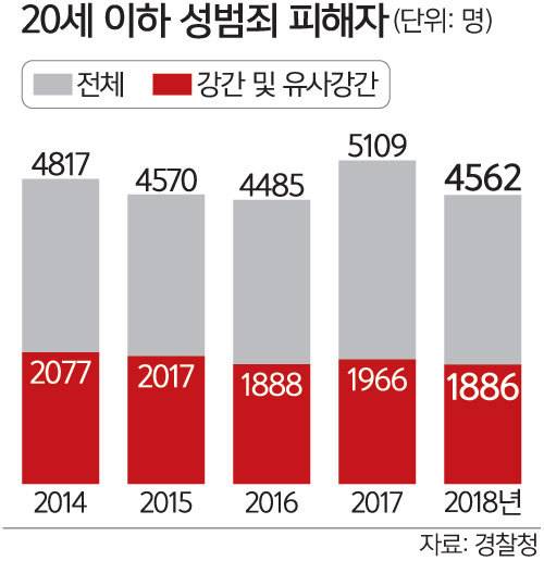 매년 4000∼5000명의 아이가 성범죄에 노출되며 그중 41.3%(2018년 기준)가 강간·유사강간 피해를 입는다.