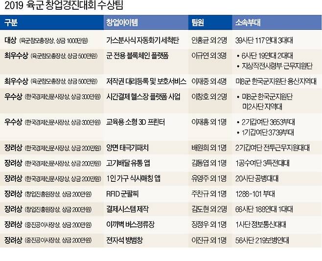 21일 대전 평촌동 KT&G 인재개발원에서 열린 ‘2019 육군 창업경진대회’ 대상에는 장전과 발사만으로 총기를 세척할 수 있는 ‘가스 분사식 총기 세척탄’이 선정됐다. 39사단 117연대 소속 장병 세 명이 3개월간 머리를 짜서 기획한 혁신 아이템이다.