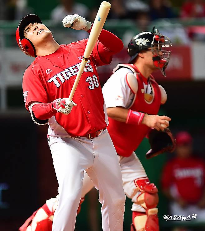 [엑스포츠뉴스 인천, 김한준 기자] 24일 오후 인천SK행복드림구장에서 열린 '2019 신한은행 MY CAR KBO리그 KIA 타이거즈와 SK 와이번스의 경기, 9회초 무사 1,3루 KIA 유민상이 헛스윙 삼진을 당한 후 아쉬워하고 있다.