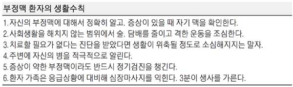 이 같은 질환이 처음 발생했을 때부터 환자가 적절한 혈압치료와 관상동맥 질환을 악화시킬 수 있는 당뇨병, 고지혈증 치료를 적극적으로 했다면 병의 발생을 늦출 수 있다. 또한 일부 부정맥은 스트레스, 과로, 과도한 음주, 카페인(커피) 섭취, 흡연과 연관돼 발생하는 경우가 있어 이에 대한 절제가 필요하다. 특히 알코올은 부정맥을 악화시키는 주범으로 알려져 있다. 부정맥 환자는 충분히 안정된 상태에서 와인 1잔 또는 2잔 정도 가능하지만 주의해야 한다. 부정맥은 고혈압, 관상동맥질환 등과 동반되는 경우가 많아 기름진 음식이나 육류, 튀긴 음식을 피하는 게 좋다. 또 환자 가족은 응급상황에 대비해 반드시 심장마사지법을 숙지해야 한다.