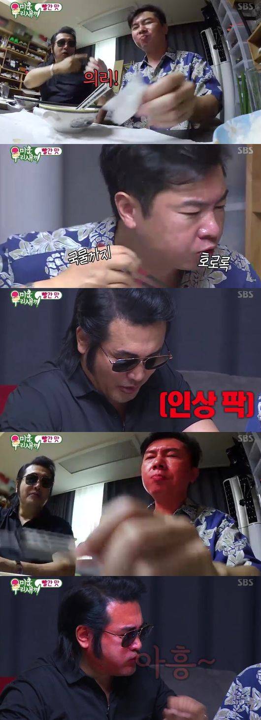 김보성은 잠시 기침을 하더니 "목이 간질해서 그런 거지 매워서 그런 것 아니다"며 승부욕이 발동했다. 임원희는 "강렬하게 의리로 이런 거 먹어줘야한다"며 사천고추를 집어들자 김보성은 "난 두 개"라며 이에 지지 않았다. 임원희를 이기려는 묘한 심리전이 펼쳐졌다. 이상민은 "상남자만 한다는 뜨거운 국물에 고추먹기"라며 분위기를 더욱 몰았다. 임원희는 계속해서 "의리"를 외치며 먹방, 김보성은 "남자다"며 인정했다.