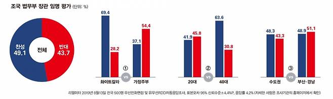 자녀 문제는 고위 공직자의 검증에 있어 필수적인 항목이다. 특히 학생운동권 중심에서 활동하며 당대 학우들의 마음을 사로잡았고 현재는 서울대 교수로 재직하며 많은 20대 대학생들의 롤모델이 되어왔던 조 후보자다. 자신으로부터 배움을 받는 젊은이들에겐 정의를 이야기하면서 자신은 그렇지 못했다면 표리부동하다. 조국 전 민정수석의 법무장관 임명에 가장 적극적인 찬성 여론을 보인 계층이 40대다. 90년대 학번들이다. SNS를 통해 사회적 규범을 강조해 온 조 후보자였기 때문에 40대의 지지를 꾸준히 받았다. 오마이뉴스 여론조사 결과 40대의 조국 후보자 지명 찬성 여론은 응답자 10명 중 6명이 넘는다. 반대보다 2배 이상 찬성 의견이 많을 정도다. 그러나 이것 또한 자녀 의혹이 부상하기 전이다. 화이트칼라층과 마찬가지로 40대는 우리 사회의 중간 지대에 있다. 특히 자녀 교육은 가장 큰 관심사다. 정시와 수시로 나뉜 대입 수험생이 있는 집은 온 가족의 신경이 곤두서 있다. 그런데 조 후보자 딸의 진학이 40대 계층들의 일반적인 이해 범주를 벗어난다면 이것이야말로 큰 위기다. 자신의 일보다 자녀 관련 문제에 더 예민한 것이 일반적인 부모의 태도다. 조 후보자에 대해 20대는 오차범위 내 지명 반대 의견이 조금 더 높을 정도로 연령별 반응이 엇갈린다.