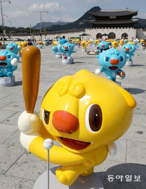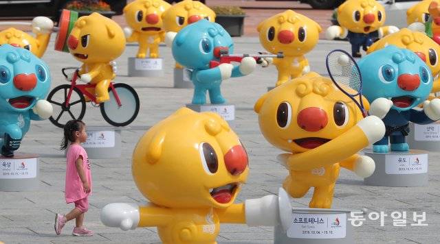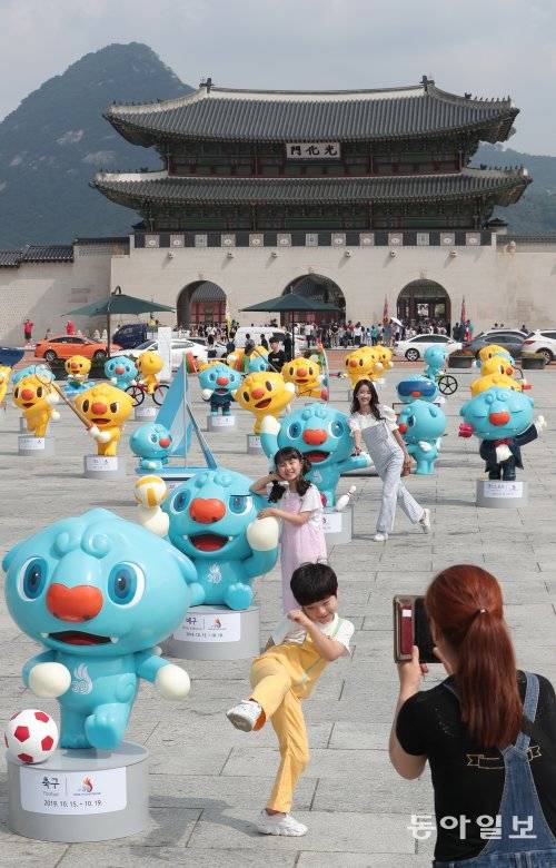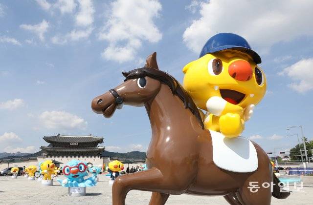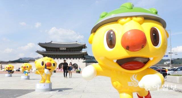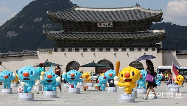 26일 오전 서울 광화문 광장 북쪽이 노랑과 파랑으로 물들었습니다. 귀여운 모습의 조형물들이 눈길을 끄네요. 제100회 전국체육대회 및 제39회 전국장애인체육대회의 마스코트 해띠(노랑)와 해온(파랑)입니다.