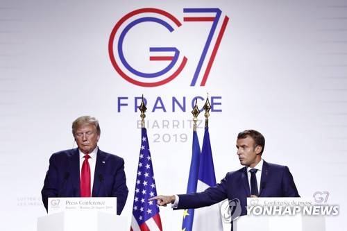 epa07795337 French President Emmanuel Macron (R) and US President Donald J. Trump (L) hold a press conference on the closing day of the G7 summit in Biarritz, France, 26 August 2019. EPA/IAN LANGSDON