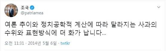 →“여론 추이와 정치공학적 계산에 따라 달라지는 사과의 수위와 표현방식에 더 화가 납니다...”(2014년 5월 6일)