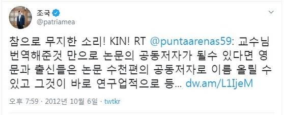 →“참으로 무지한 소리! KIN!”(“교수님 번역해준 것만으로 논문의 공동저자가 될 수 있다면…”라는 글을 리트윗하며)(2012년 10월 6일)