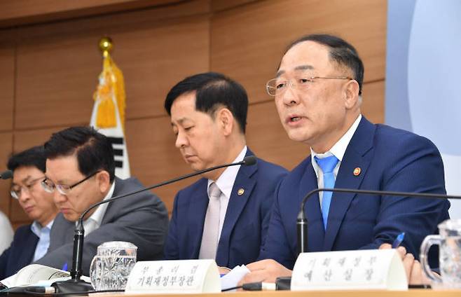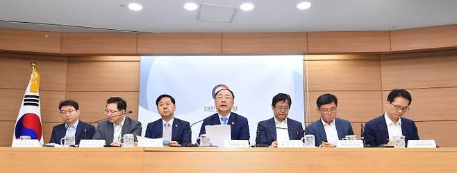 왼쪽부터 이억원 기재부 경제정책국장, 이승철 기재부 재정관리관, 구윤철 기재부 2차관, 홍남기 기재부 부총리, 안일환 기재부 예산실장, 안도걸 기재부 예산총괄심의관, 임재현 기재부 조세총괄정책관.