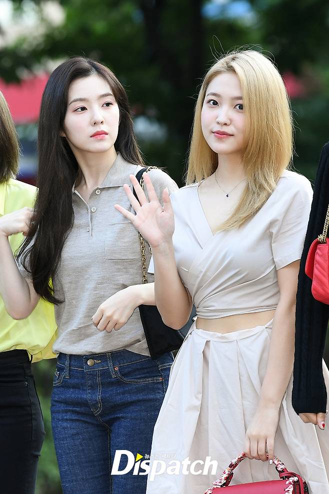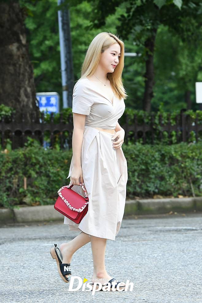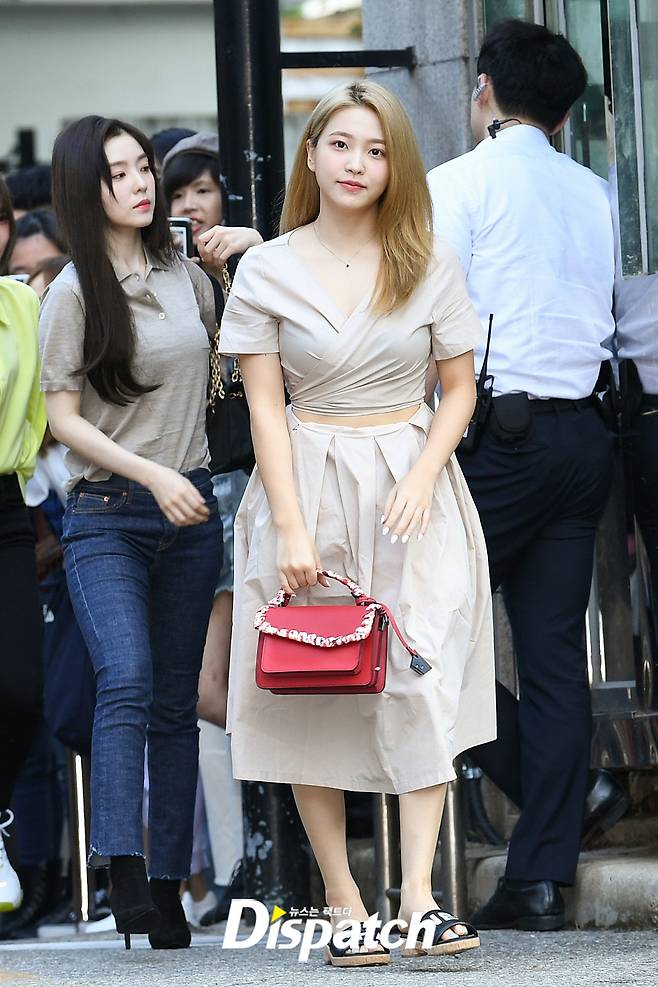 '레드벨벳' 예리는 베이지 원피스와 슬리퍼, 핸드백으로 출근길룩을 완성했다.