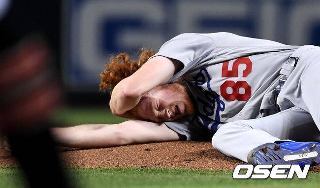 4회말 1사 만루 상황 애리조나 제이크 램의 2타점 동점 내야 안타 때 타구에 머리를 맞은 다저스 투수 더스틴 메이가 쓰러져 고통스러워 하고 있다. /dreamer@osen.co.kr