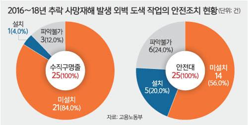 2일 고용노동부에 따르면 2016∼2018년 추락 사망재해가 발생한 외벽 도색 작업 총 25건 중 수직구명줄을 설치하지 않은 것으로 확인된 경우는 21건으로 84.0%에 달했다.