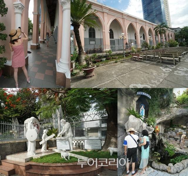 콩카페에 몇 분만 걸으면 유명한 핑크빛 대성당이 나온다. 분홍색 성당이 이색적이어서 인증샷 명소로 인기가 높은 곳으로, 프랑스 식민지 시대인 1923년 지어진 네오고딕 양식의 가톨릭 성당이다. 다낭에서는 '수탉 교회(Nha Tho Con Ga)'라고도 불리는데, 성당 첨탑 꼭대기에 닭 조형물이 있어서라고. 대성당에 가보니 역시나, 이 곳 저곳에서 기념사진을 찍는 모습이 눈에 들어온다. 성당 뒤쪽에는 성모마리아상과 성수가 있다.