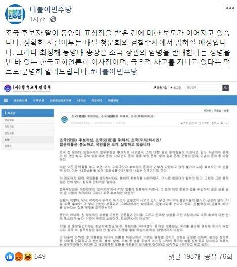 ▲더불어민주당 “최성해, 극우적 사고” 페북 논란= 5일 오후 더불어민주당은 자당의 페이스북에 “최성해 동양대 총장은 조국 장관의 임명을 반대한다는 성명을 낸 바 있는 한국교회언론회 이사장이며, 극우적 사고를 지니고 있다는 팩트도 분명히 알려드린다”라고 적었다.