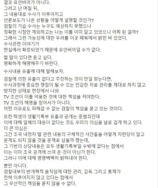 김 교수는 이러한 모든 의혹과 문제 제기를 들어 윤 총장에게 진실 규명을 촉구했다. 그는 “조 후보자 자녀의 생활기록부를 불법적으로 공개한 자유한국당 의원 주광덕을 구속수사하라”면서 “수사내용 유출이 사실이 아니라면 수사현장 관리를 제대로 하지 않아 민감한 자료 유출이 가능하도록 한 현장 수사관이 누구인지 밝히고 엄중하게 책임을 물어야 한다”고 요구했다.