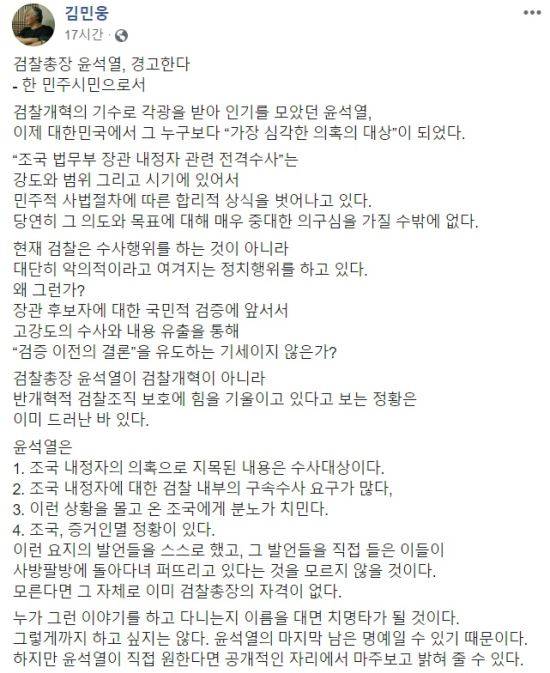 김 교수는 4일 자신의 페이스북 계정에 올린 '검찰총장 윤석열, 경고한다'는 게시글을 통해 "검찰개혁의 기수로 각광을 받아 인기를 모았던 윤석열, 이제 대한민국에서 가장 '심각한 의혹의 대상'이 되었다"고 운을 뗐다.