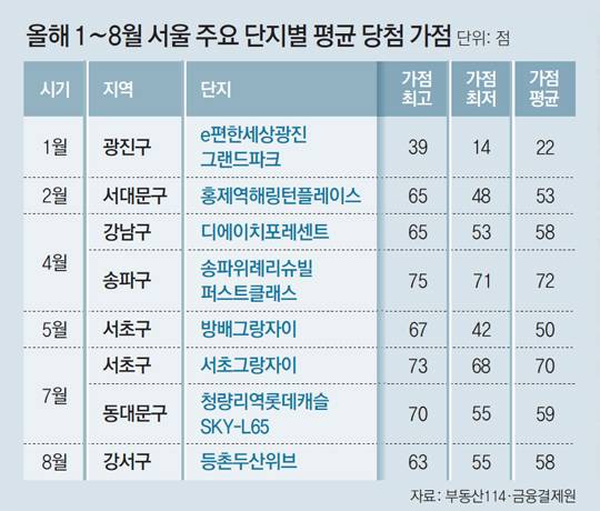5일 부동산정보서비스업체 부동산114가 금융결제원의 아파트 당첨 가점을 조사한 결과 올해 1∼8월 서울 아파트의 평균 당첨 가점(커트라인)은 43점으로 집계됐다. 이 점수는 45세 이상의 기혼자라면 누구나 가능하다. 현행 청약점수는 무주택 기간(32점 만점), 부양가족 수(35점 만점), 청약통장 가입 기간(17점 만점) 등 84점 만점으로 구성된다. 45세라면 30세부터 인정되는 무주택기간의 최대치인 15년을 채우고(32점), 배우자(10점)와 청약통장 최소 보유(1점) 등을 통해 가점을 얻을 수 있다. 만약 자녀가 있거나 청약 통장 보유 기간이 길다면 30대 후반의 무주택자도 노려 볼 수 있는 점수다.